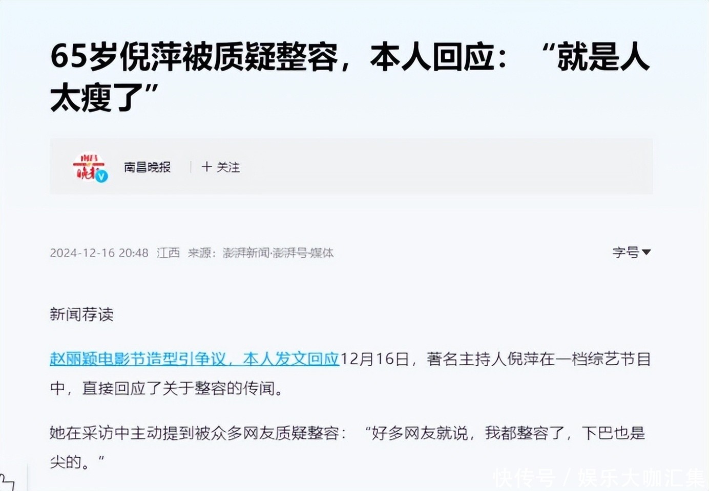 1. 倪萍老师近期频频登上热搜榜单,成为舆论关注的焦点人物。刚对容貌变化作出回应,旋即又因在节目中的犀利点评引发广泛热议。